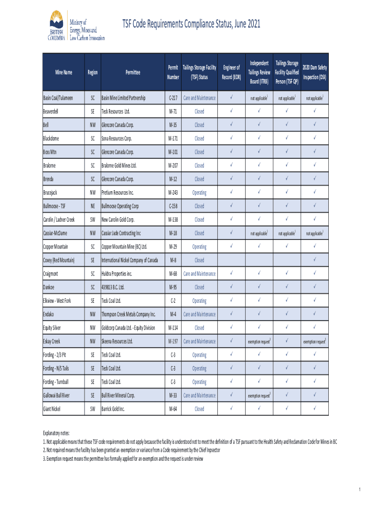 TSFCodeRequirementsComplianceStatus,June2021MineNameRegionPermitteePermit NumberTailingsStorageFacility (SF)StatusEngineerof Record(FOR)Independent TailingsReview Board(IRB)TailingsStorage 2020DamSafety