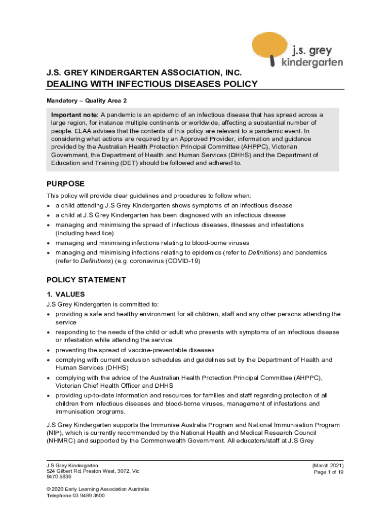 J.S. GREY KINDERGARTEN ASSOCIATION, INC.DEALING WITH INFECTIOUS DISEASES POLICY Mandatory Quality Area 2Important note: A pandemic is an epidemic of an infectious disease that has spread across a
