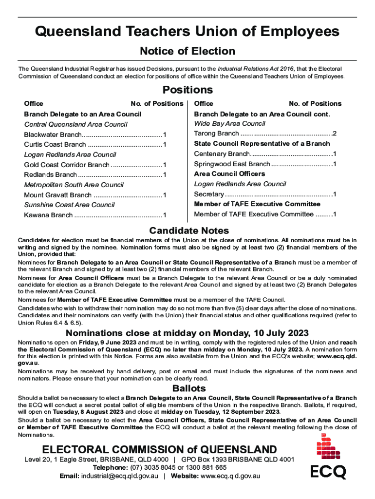 Queensland Teachers Union of Employees Notice of Election The Queensland Industrial Registrar has issued Decisions, pursuant to the Industrial Relations Act 2016, that the Electoral Commission of