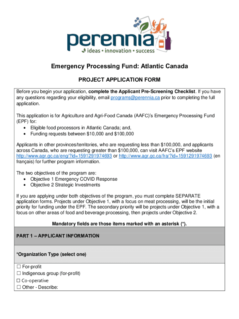 Emergency Processing Fund: Atlantic Canada PROJECT APPLICATION FORM Before you begin your application, complete the Applicant PreScreening Checklist. If you have any questions regarding your eligibility,
