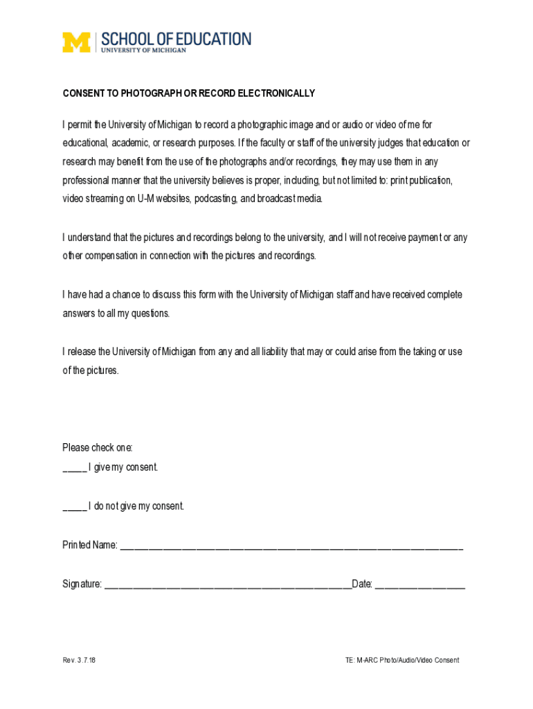 CONSENT TO PHOTOGRAPH OR RECORD ELECTRONICALLY I permit the University of Michigan to record a photographic image and or audio or video of me for educational, academic, or research purposes. If the