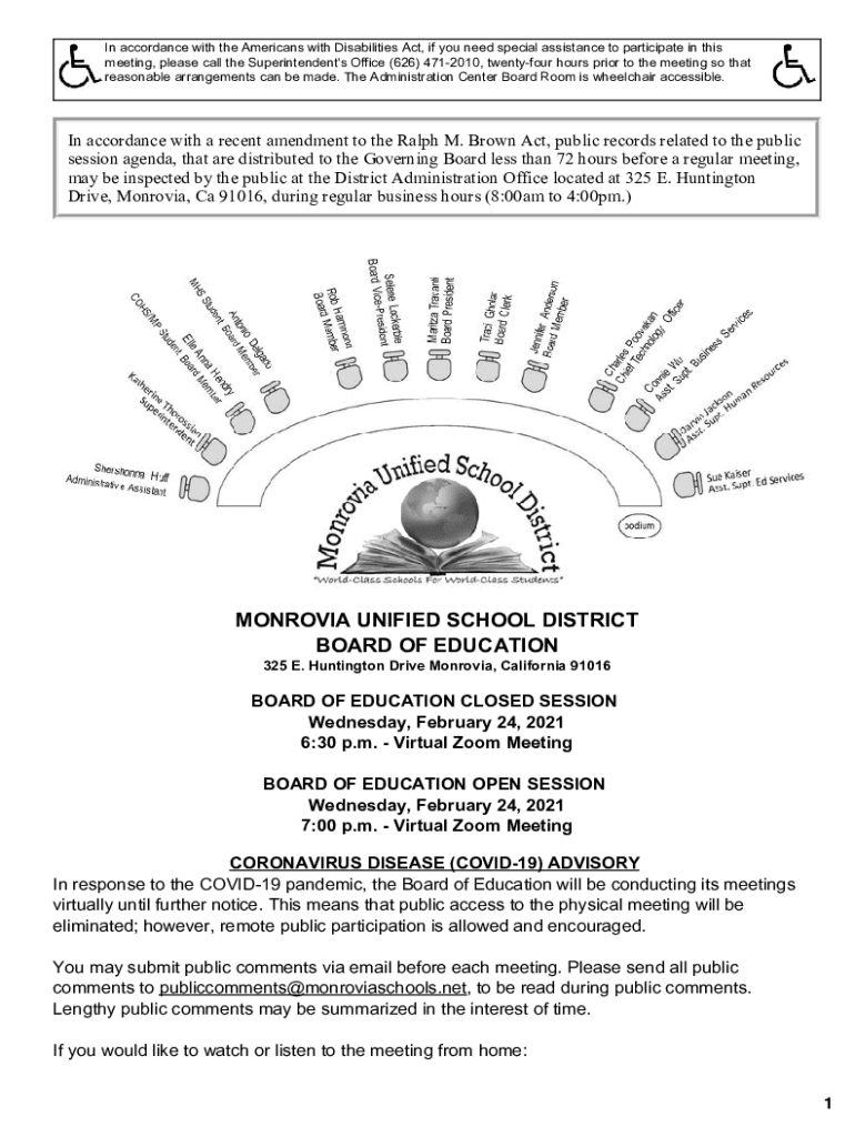 In accordance with the Americans with Disabilities Act, if you need special assistance to participate in this meeting, please call the Superintendent\'s Office (626) 4712010, twenty-four hours prior