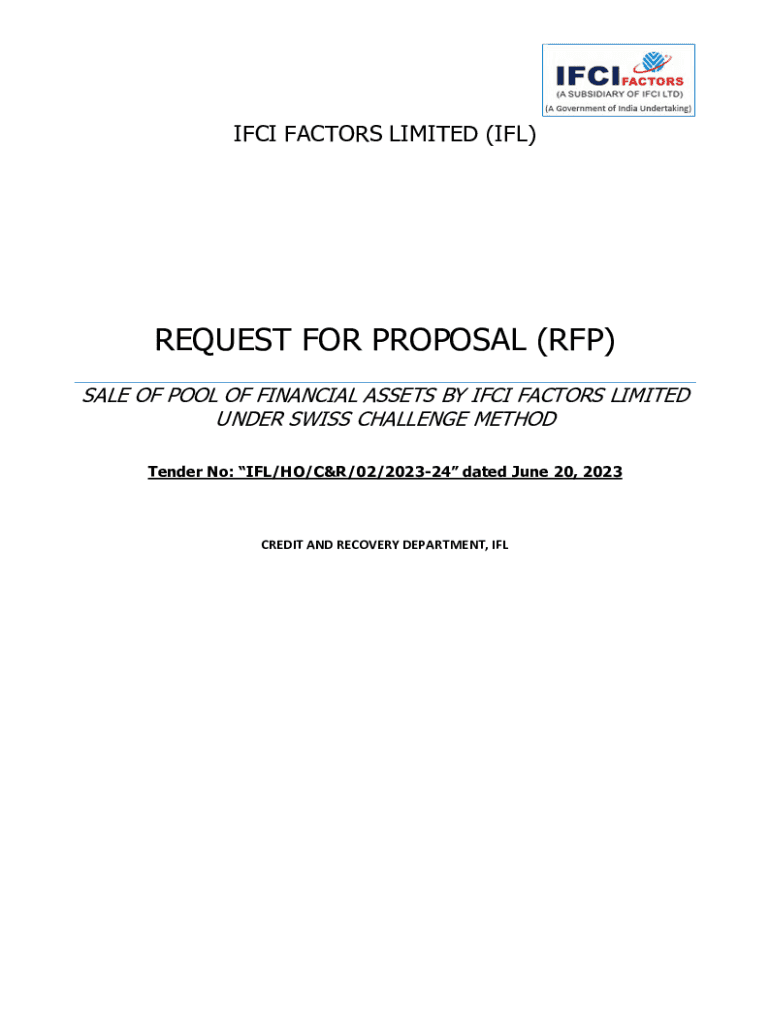 IFC FACTORS LIMITED (IFL)REQUEST FOR PROPOSAL (RFP) SALE OF POOL OF FINANCIAL ASSETS BY IFC FACTORS LIMITED UNDER SWISS CHALLENGE METHOD Tender No: IFL/HO/C&R/02/202324 dated June 20, 2023CREDIT AND
