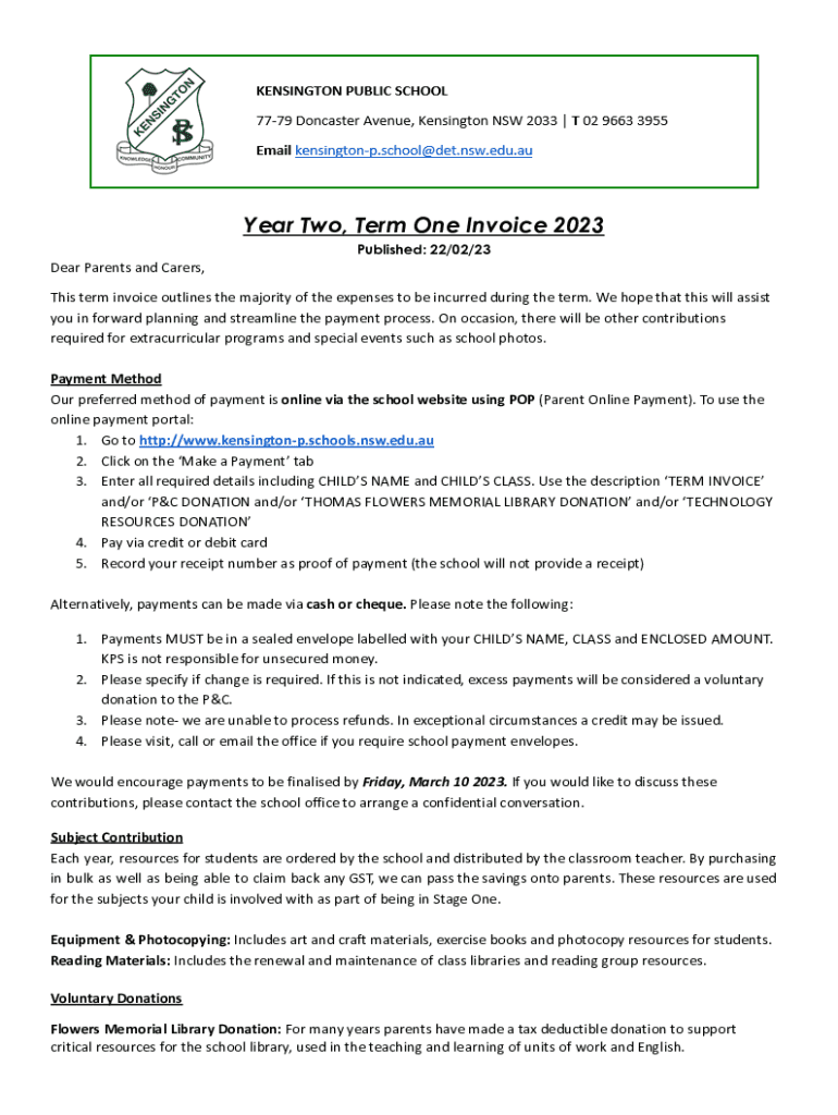 Year Two, Term One Invoice 2023 Published: 22/02/23Dear Parents and Carers, This term invoice outlines the majority of the expenses to be incurred during the term. We hope that this will assist you