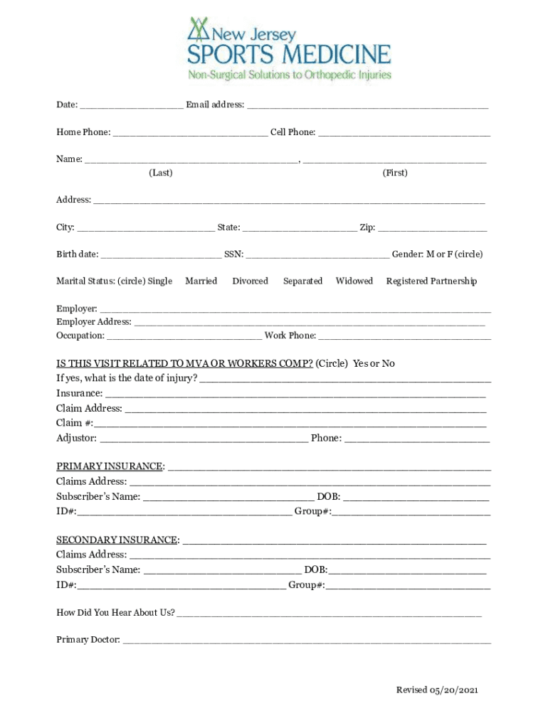 Date: ___ Email address: ___ Home Phone: ___ Cell Phone: ___ Name: ___, ___ (Last) (First) Address: ___ City: ___ State: ___ Zip: ___ Birth date: ___ SSN: ___ Gender: M or F (circle) Marital Status: