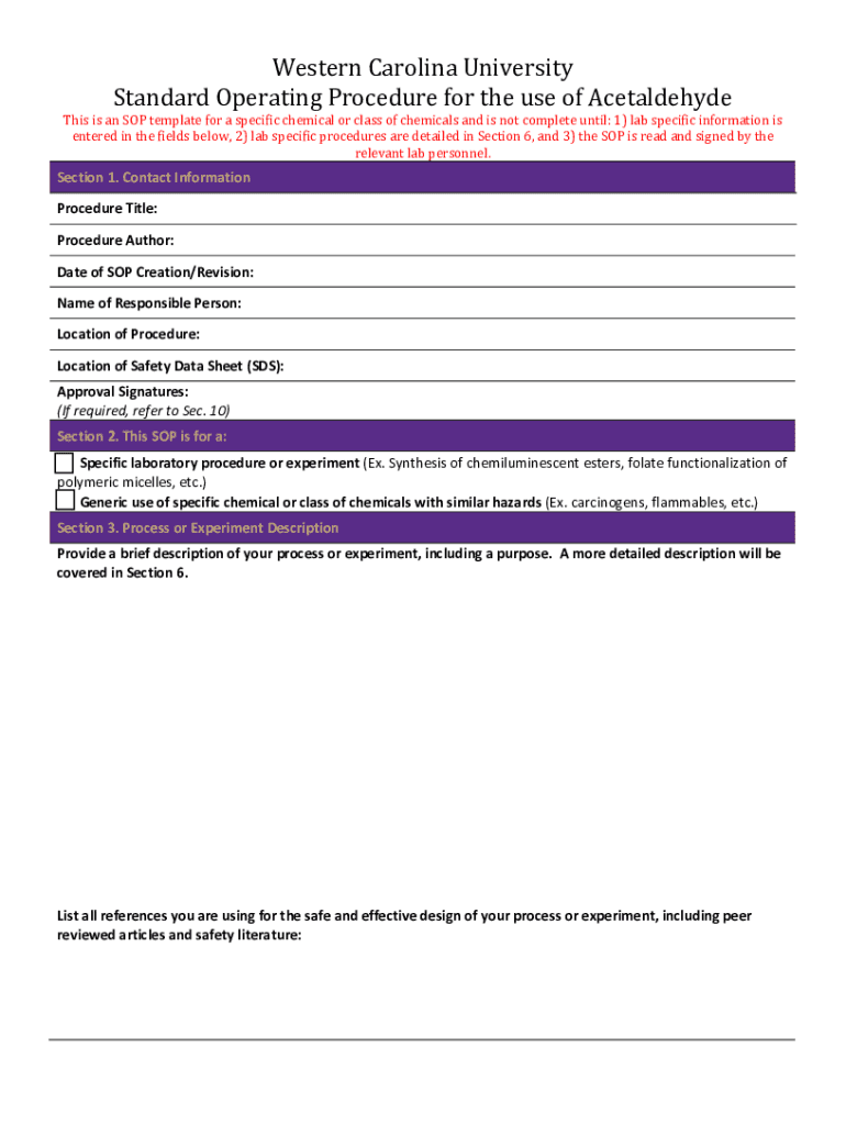 Western Carolina University Standard Operating Procedure for the use of AcetaldehydeThis is an SOP template for a specific chemical or class of chemicals and is not complete until: 1) lab specific