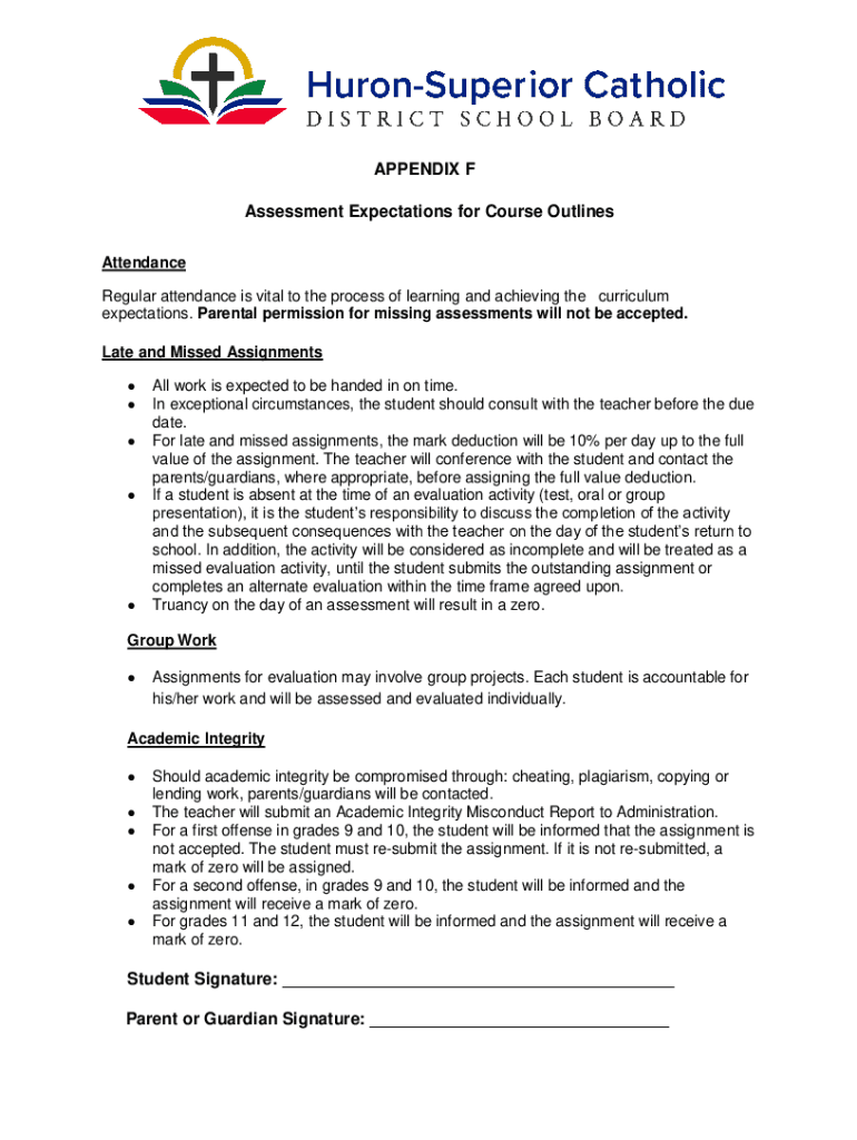 APPENDIX F Assessment Expectations for Course Outlines Attendance Regular attendance is vital to the process of learning and achieving the curriculum expectations. Parental permission for missing