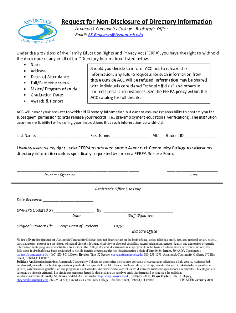 Request for Nondisclosure of Directory Information Untuck Community College Registrars Office Email: ASRegistrar@Asnuntuck.eduUnder the provisions of the Family Education Rights and Privacy Act (FER