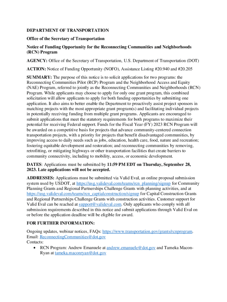 DEPARTMENT OF TRANSPORTATION Office of the Secretary of Transportation Notice of Funding Opportunity for the Reconnecting Communities and Neighborhoods (RCN) Program AGENCY: Office of the Secretary