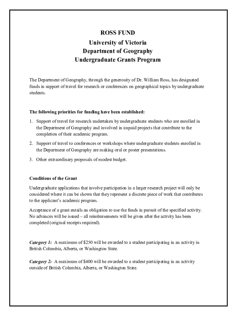 ROSS FUND University of Victoria Department of Geography Undergraduate Grants Program The Department of Geography, through the generosity of Dr. William Ross, has designated funds in support of travel
