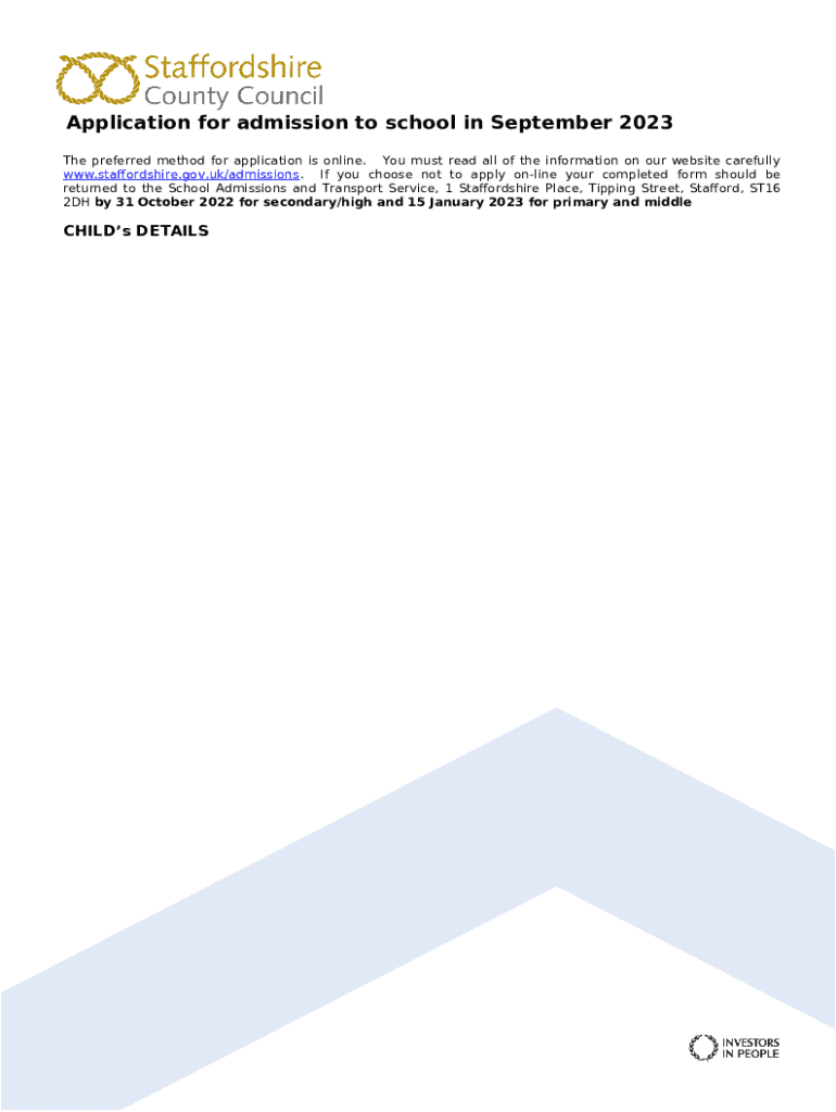 The School Admission Application Form is a document used by parents or guardians to apply for their child's admission to a school in Staffordshire, UK.