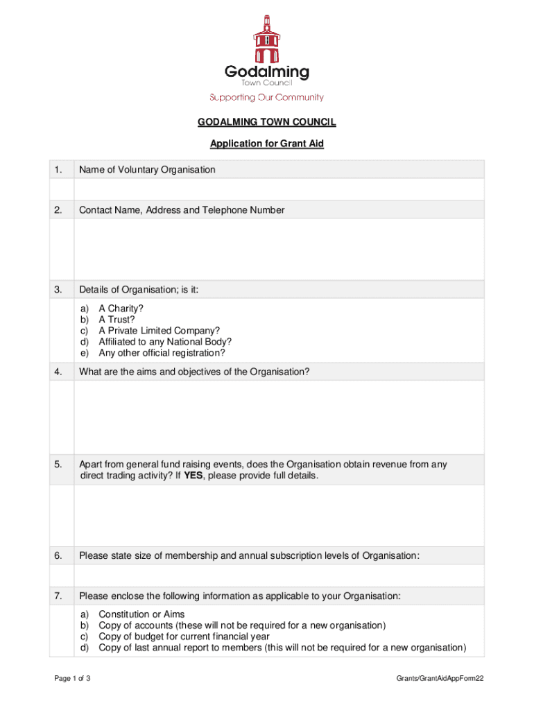 GAMING TOWN COUNCIL Application for Grant Aid 1. Name of Voluntary Organisation2. Contact Name, Address and Telephone Number3. Details of Organization; is it: a) b) c) d) e)A Charity? A Trust? A Private