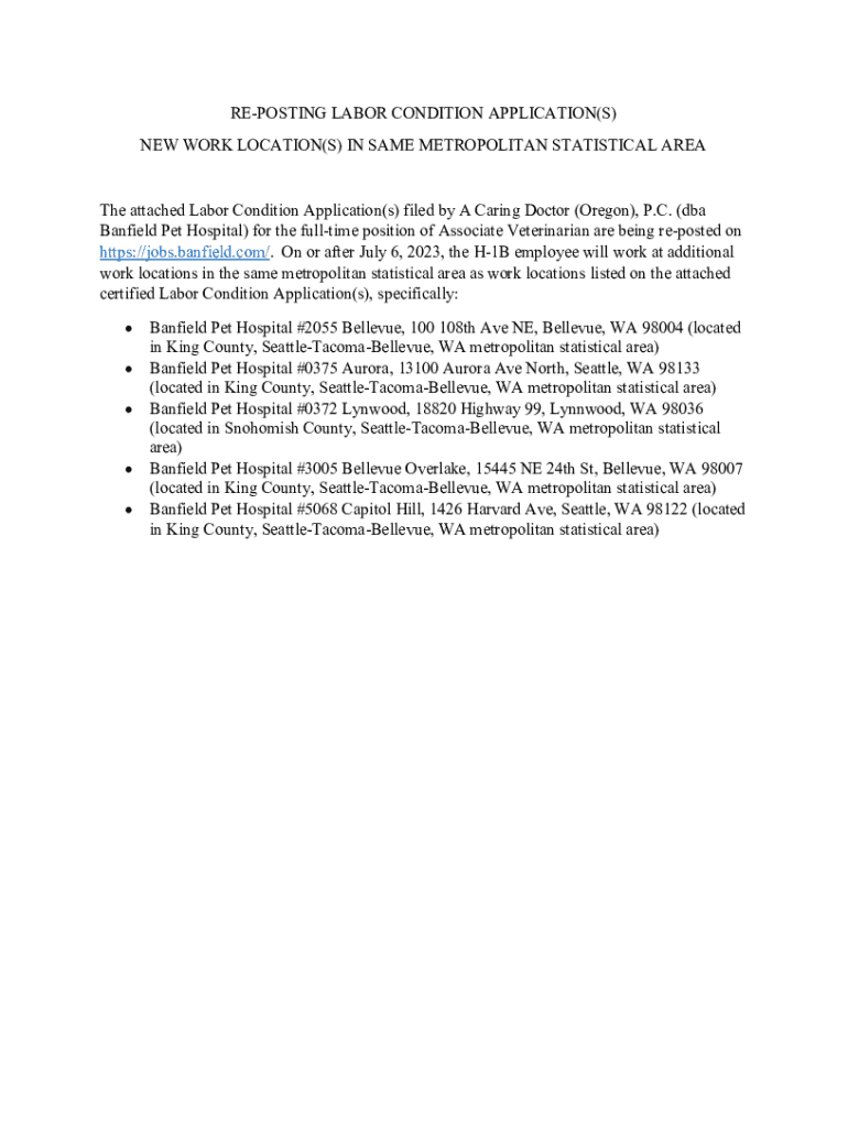 REPOSTING LABOR CONDITION APPLICATION(S) NEW WORK LOCATION(S) IN SAME METROPOLITAN STATISTICAL Breathe attached Labor Condition Application(s) filed by A Caring Doctor (Oregon), P.C. (DBA Ban field