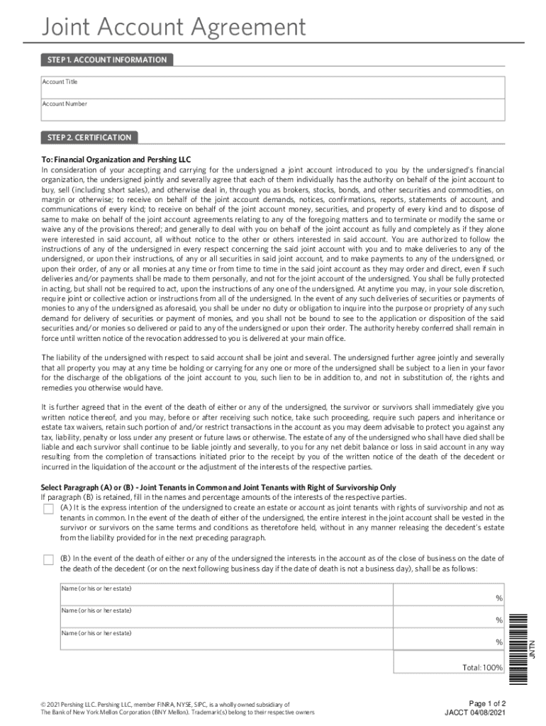 Joint Account Agreement STEP 1. ACCOUNT INFORMATION Account Title Account Number STEP 2. CERTIFICATION To: Financial Organization and Pershing LLC In consideration of your accepting and carrying for