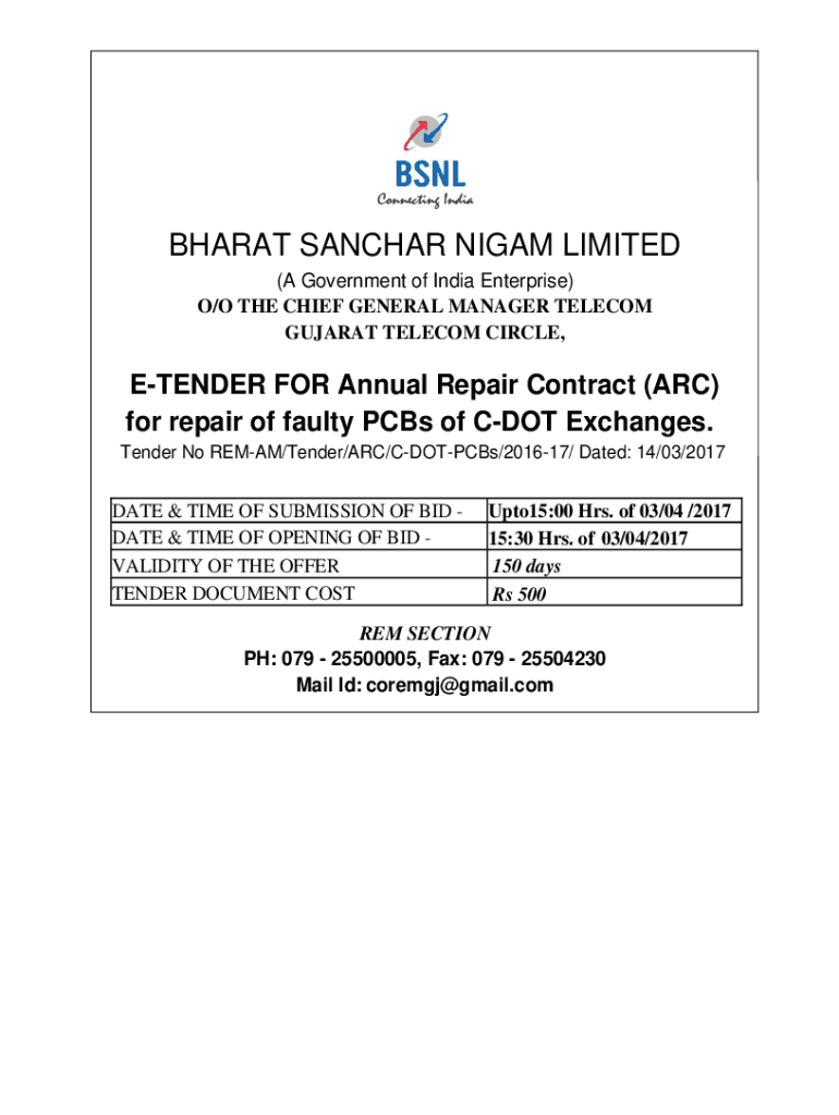 BHARAT ANCHOR NI GAM LIMITED (A Government of India Enterprise) O/O THE CHIEF GENERAL MANAGER TELECOM GUJARAT TELECOM CIRCLE, TENDER FOR Annual Repair Contract (ARC) for repair of faulty PCBs of DOT