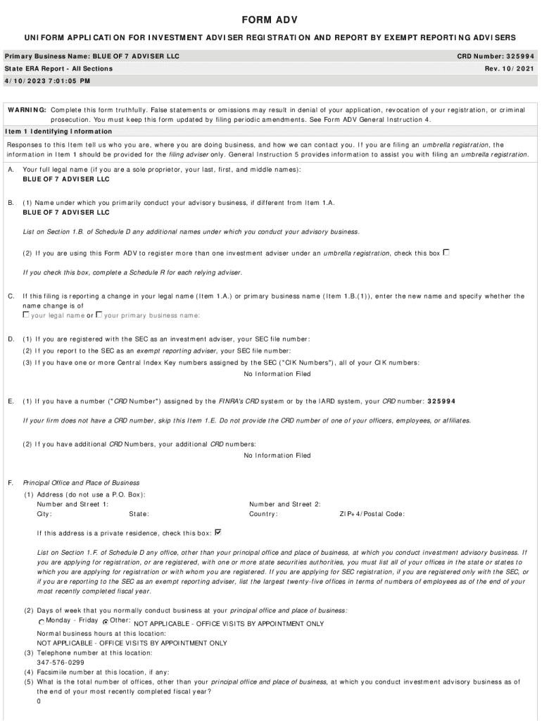 FORM ADV UNIFORM APPLICATION FOR INVESTMENT ADVISER REGISTRATION AND REPORT BY EXEMPT REPORTING ADVISERS Primary Business Name: BLUE OF 7 ADVISER LLC CRD Number: 325994State ERA Report All Sections