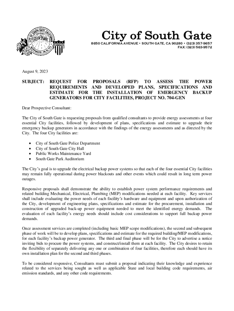 City of South Gate 8650 CALIFORNIA AVENUE SOUTH GATE, CA 90280 (323) 3579657 FAX: (323) 5639572August 9, 2023SUBJECT:REQUEST FOR PROPOSALS (RFP) TO ASSESS THE POWER REQUIREMENTS AND DEVELOPED PLANS,