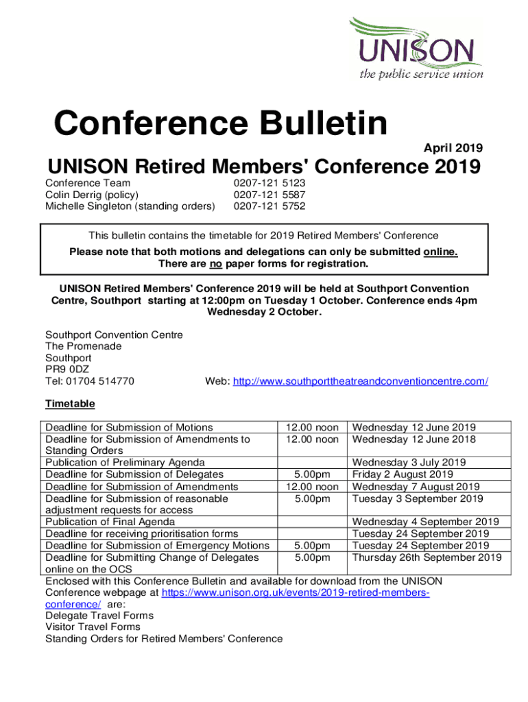 Conference Bulletin April 2019UNISON Retired Members\' Conference 2019 Conference Team Colin Debris (policy) Michelle Singleton (standing orders)0207121 5123 0207121 5587 0207121 5752This bulletin