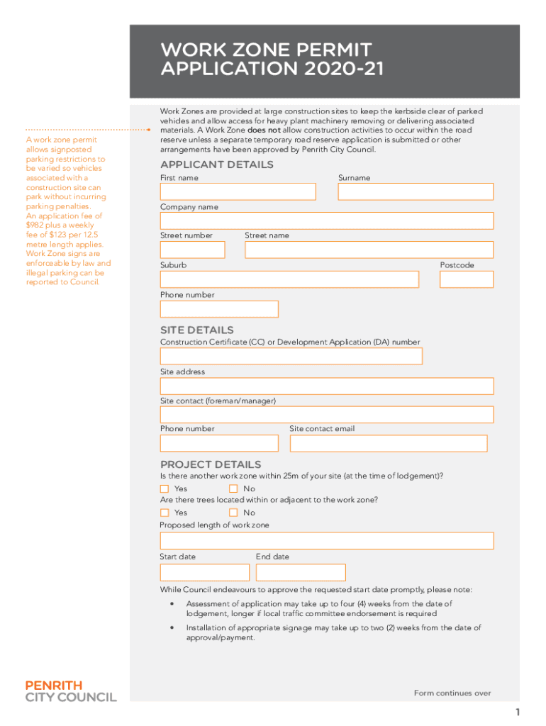 WORK ZONE PERMIT APPLICATION 202021A work zone permit allows signposted parking restrictions to be varied, so vehicles associated with a construction site can park without incurring parking penalties.