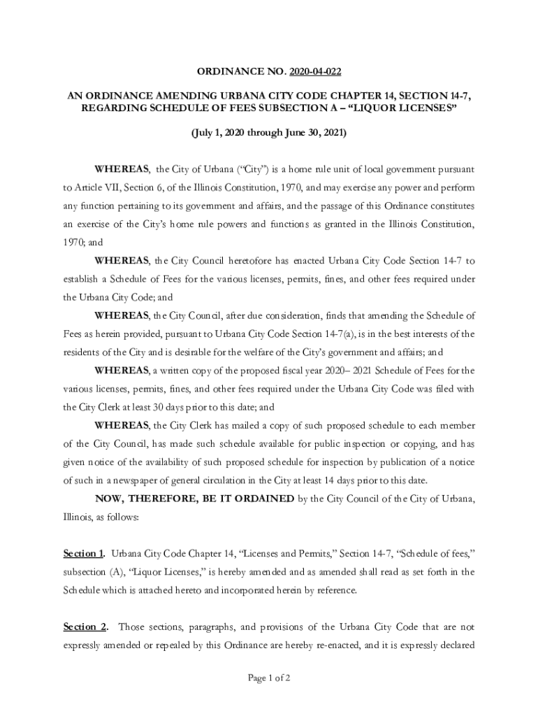ORDINANCE NO. 202004022 AN ORDINANCE AMENDING URBANA CITY CODE CHAPTER 14, SECTION 147, REGARDING SCHEDULE OF FEES SUBSECTION A LIQUOR LICENSES (July 1, 2020, through June 30, 2021) WHEREAS, the City