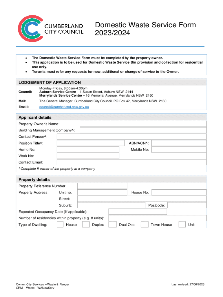 Domestic Waste Service Form 2023/2024 The Domestic Waste Service Form must be completed by the property owner. This application is to be used for Domestic Waste Service Bin provision and collection
