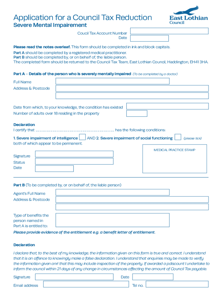 Application for a Council Tax Reduction Severe Mental ImpairementCoucil Tax Account Numerate Please read the notes overleaf. This form should be completed in ink and block capitals. Part A should