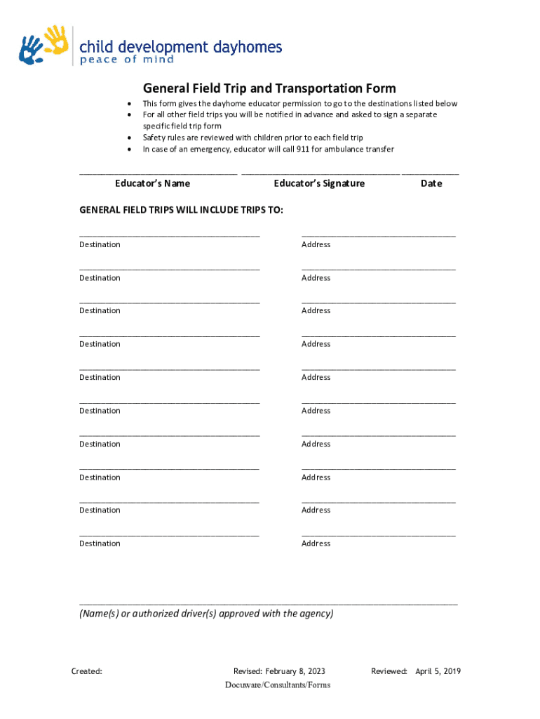 General Field Trip and Transportation Forms form gives the day home educator permission to go to the destinations listed below For all other field trips you will be notified in advance and asked to