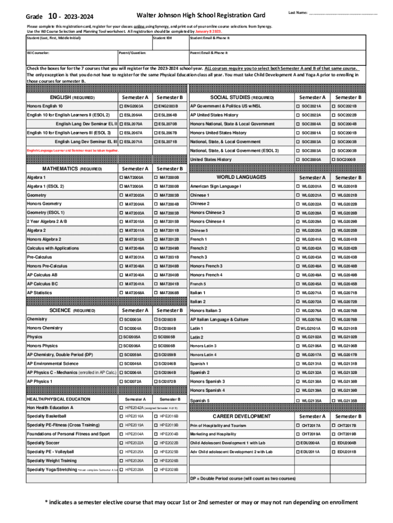 10 Grade Walter Johnson High School Registration Card20232024Last Name: ___Please complete this registration card, register for your classes online using Synergy, and print out of your online course