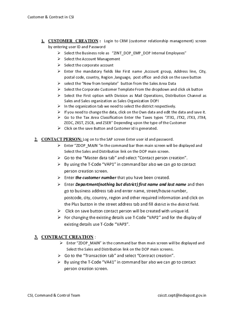 Customer&ContractinCSI1. CUSTOMER CREATION : Login to CRM (customer relationship management) screen byenteringuserIDandPassword SelecttheBusinessroleasZINT_DOP_EMP_DOPInternalEmployees SelecttheAccountManagement