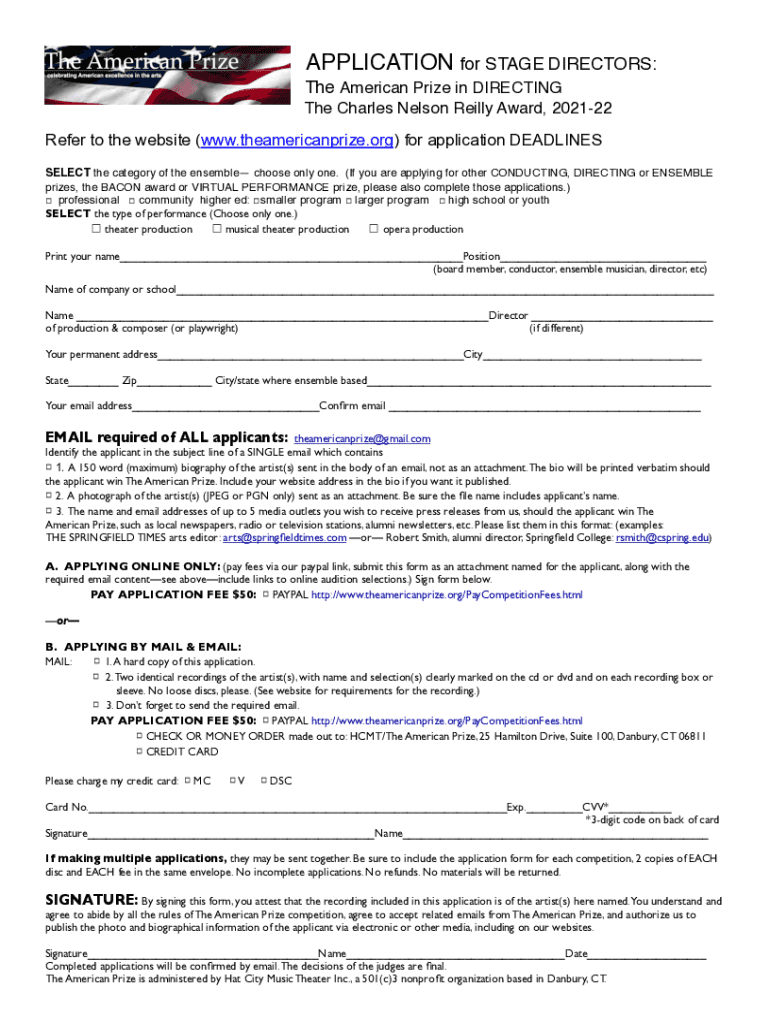 The American Prize in DIRECTION The Charles Nelson Reilly Award, 202122 Refer to the website (www.theamericanprize.org) for application DEADLINES SELECT the category of the ensemble choose only one.