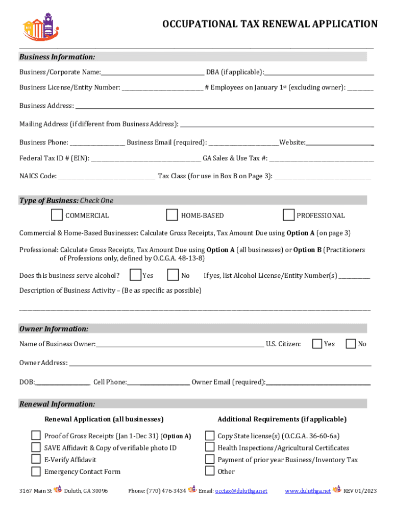 OCCUPATIONAL TAX RENEWAL APPLICATION ___Business Information:Business/Corporate Name:DBA (if applicable):_Business License/Entity Number: ___ # Employees on January 1st (excluding owner): ___ Business