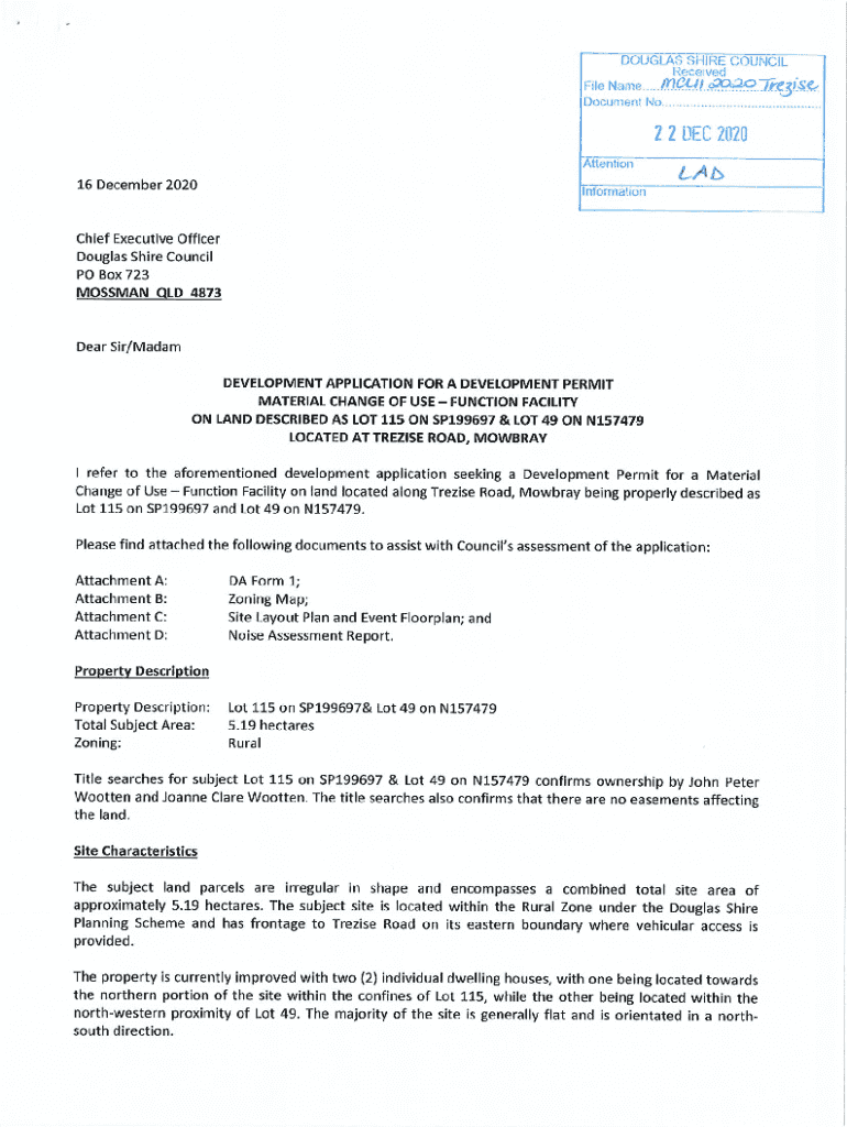 Main BC.^oTf^^7. 2 ^:16 December 2020i/mischief Executive Officer Douglas Shire Council PO Box 723 OSMAN QLD 4873DearSir/MadamDEVELOPMENT APPLICATION FOR A DEVELOPMENT PERMIT MATERIAL CHANGE OF USE
