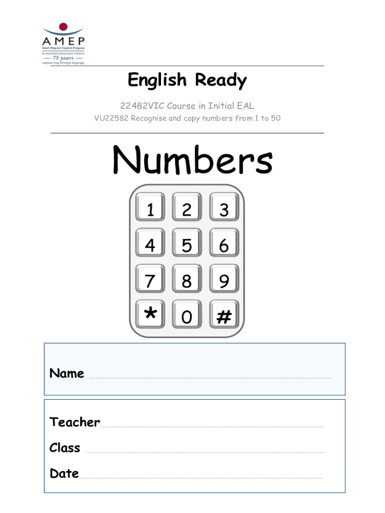 English Ready 22482VIC Course in Initial EAL VU22582 Recognize and copy numbers from 1 to 50NumbersName1234567890#___Teacher___ Class___Date___Design team: Vicki Gambling, Sue Paul, Frida Dean, Denise