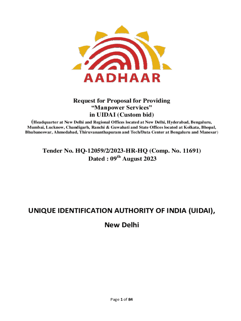 Request for Proposal for Providing Manpower Services in UI DAI (Custom bid) (Headquarter at New Delhi and Regional Offices located at New Delhi, Hyderabad, Bengaluru, Mumbai, Lucknow, Chandigarh,