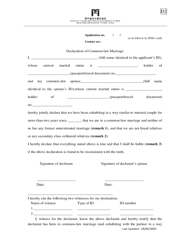 D2Application no.// (to be filled in by IPI Ms staff)Contact no.:Declaration of Common law Marriage I, ___ (full name identical to the applicants ID), whosecurrentmaritalstatusis___, holder of___(passport/travel