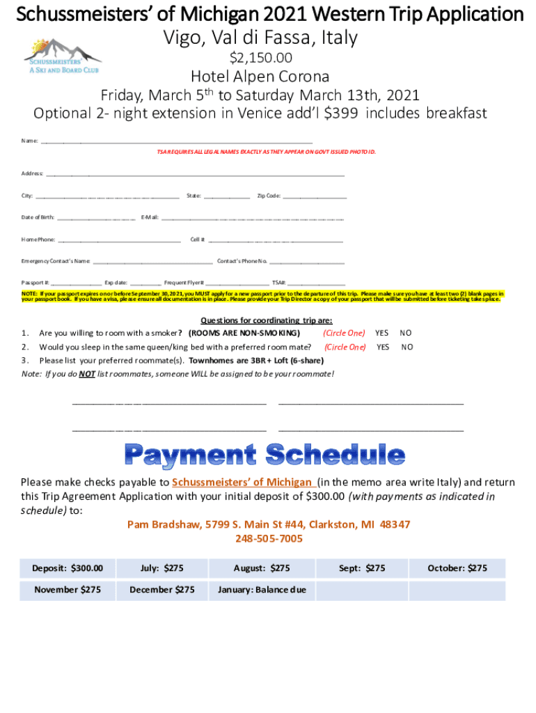 Schoolmasters of Michigan 2021 Western Trip Application Vigo, Val di Fossa, Italy $2,150.00Hotel Alien Corona Friday, March 5th to Saturday, March 13th, 2021 Optional 2 night extension in Venice add