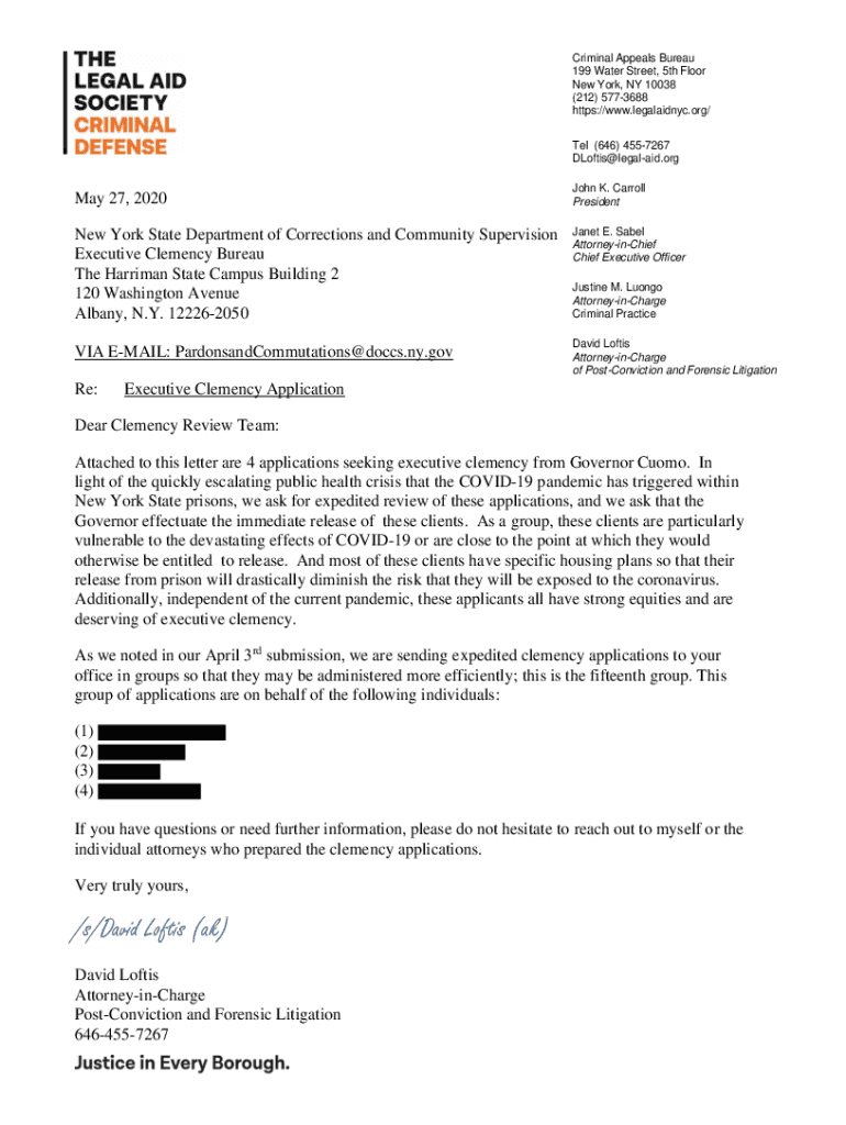 Criminal Appeals Bureau 199 Water Street, 5th Floor New York, NY 10038 (212) 5773688 https://www.legalaidnyc.org/ Tel (646) 4557267 DLoftis@legalaid.orgMay 27, 2020 New York State Department of Corrections