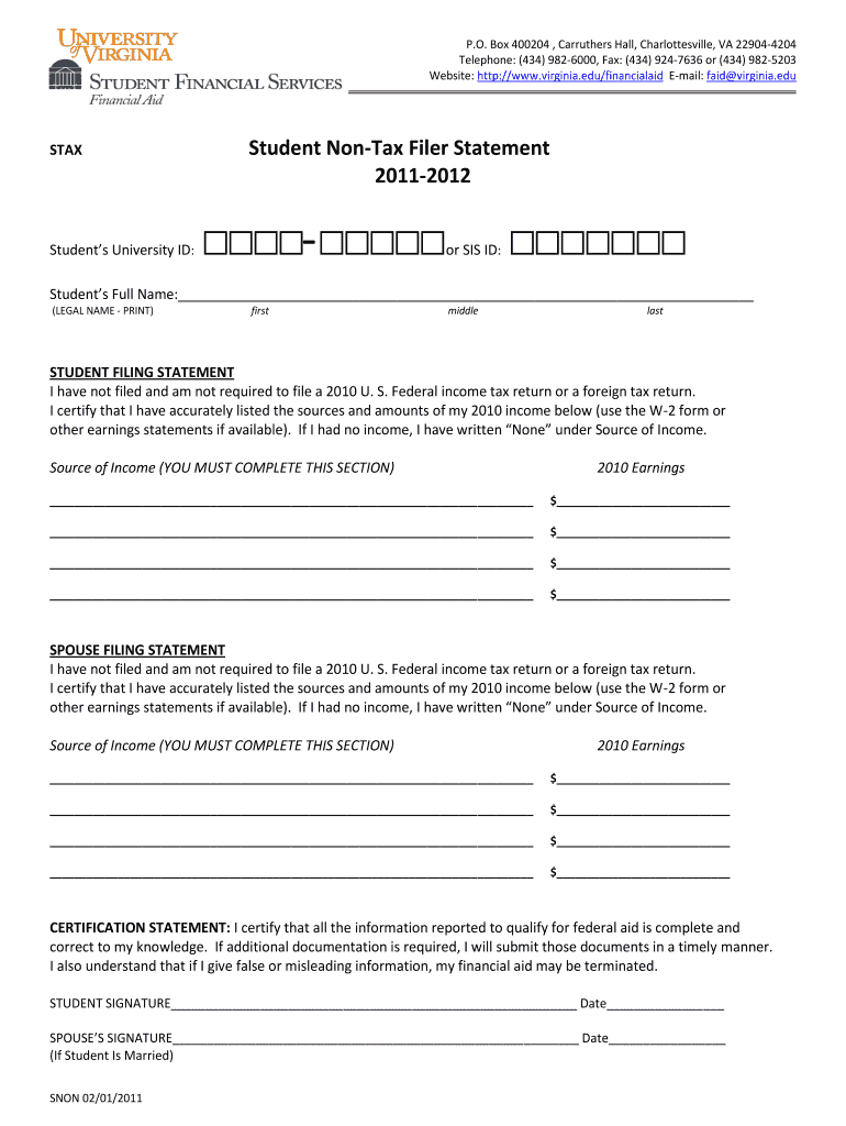 The Student Non-Tax Filer Statement is a crucial federal aid application form designed for students who have not filed a U.S. Federal income tax return. Its purpose is to certify that these students are not required to submit a tax return for the academic year 2, particularly at the University of Virginia. This form plays a significant role in the financial aid process, helping determine eligibility for grants and loans.