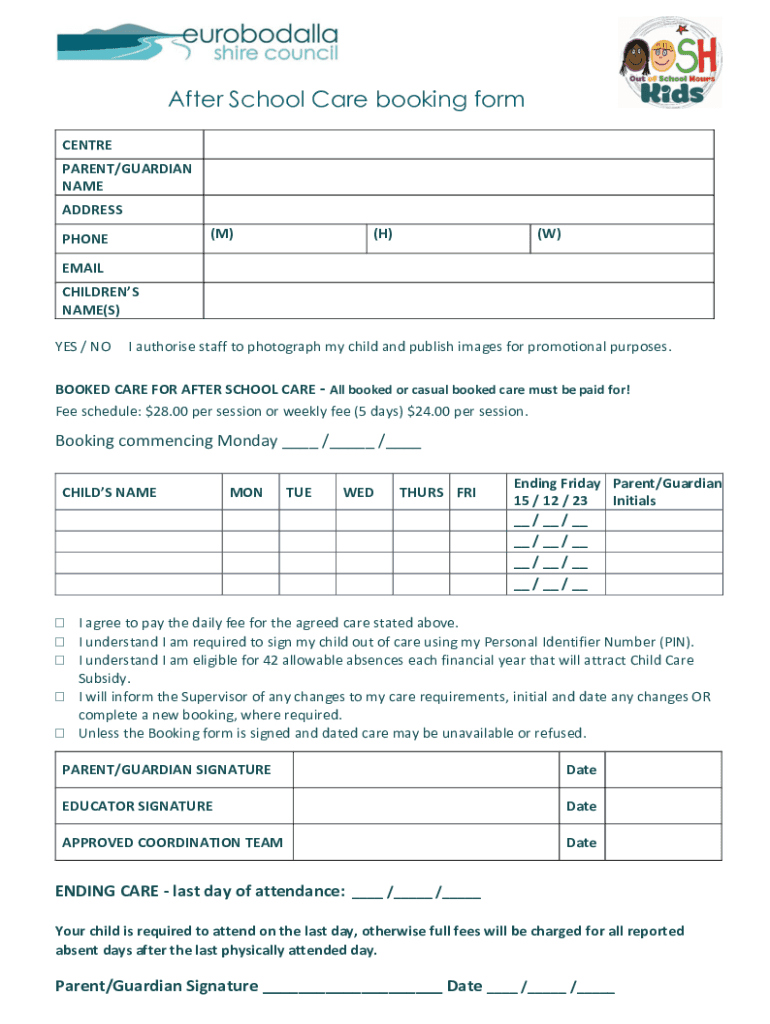 After School Care booking form Center PARENT/GUARDIAN NAME ADDRESS (M)PHONE(H)(W)EMAIL CHILDREN NAME(S) YES / NOI authorize staff to photograph my child and publish images for promotional purposes.