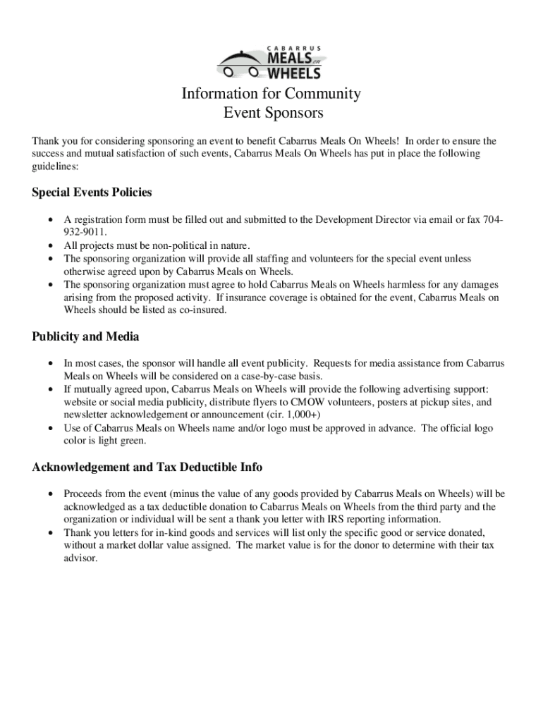 Information for Community Event Sponsors Thank you for considering sponsoring an event to benefit Cabarets Meals On Wheels! In order to ensure the success and mutual satisfaction of such events, Cabarets