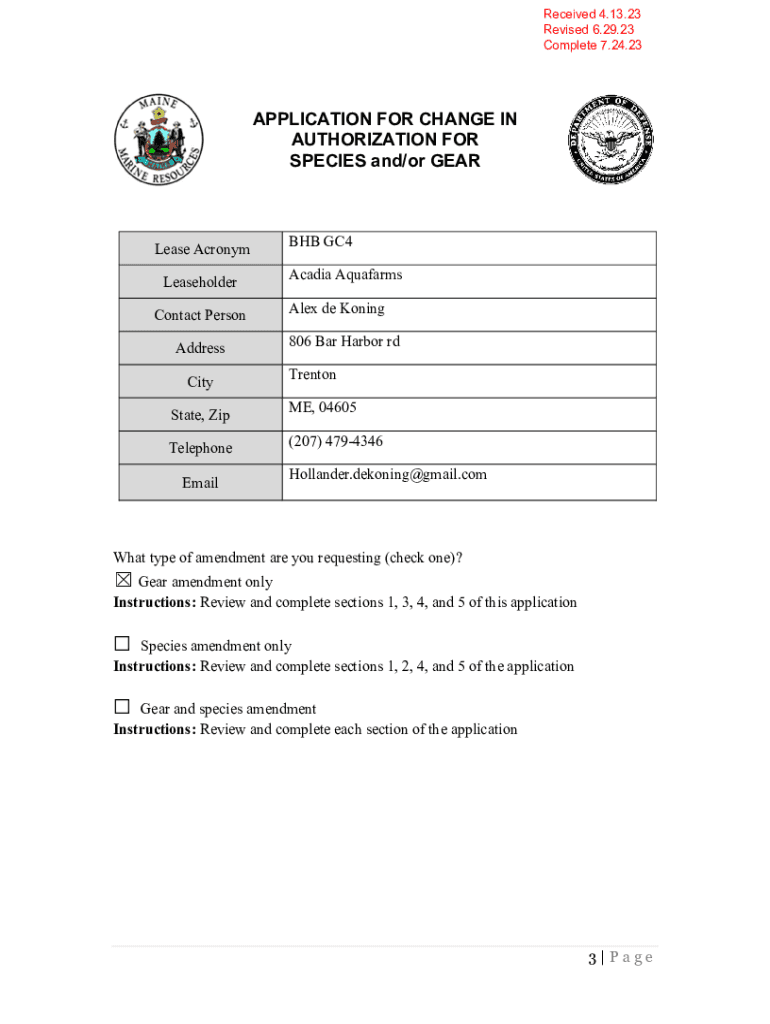 Received 4.13.23 Revised 6.29.23 Complete 7.24.23APPLICATION FOR CHANGE IN AUTHORIZATION FOR SPECIES and/or Release Acronym Leaseholder Contact Person Address City BHB GC4 Acadia Aqua farms Alex de