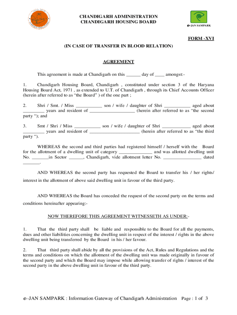 CHANDIGARH ADMINISTRATION CHANDIGARH HOUSING Boardman SAMPARKFORM XVI (IN CASE OF TRANSFER IN BLOOD RELATION)AGREEMENT This agreement is made at Chandigarh on this ___ day of ___ amongst:1. Chandigarh