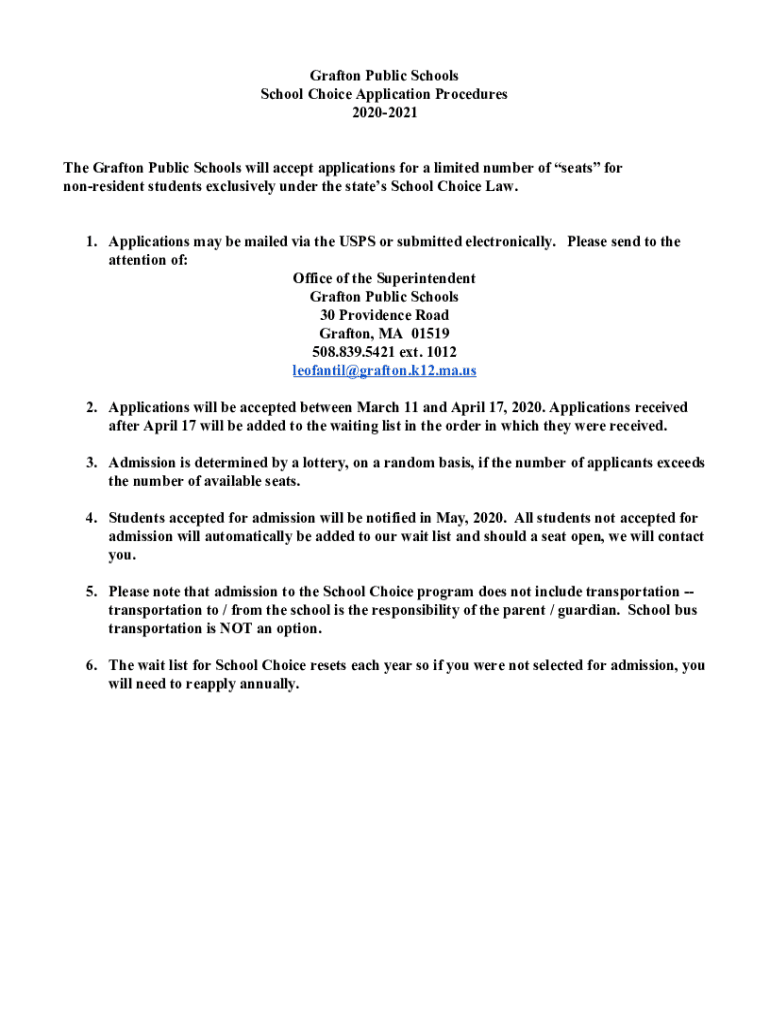 Grafton Public Schools School Choice Application Procedures 20202021 The Grafton Public Schools will accept applications for a limited number of seats for nonresident students exclusively under the