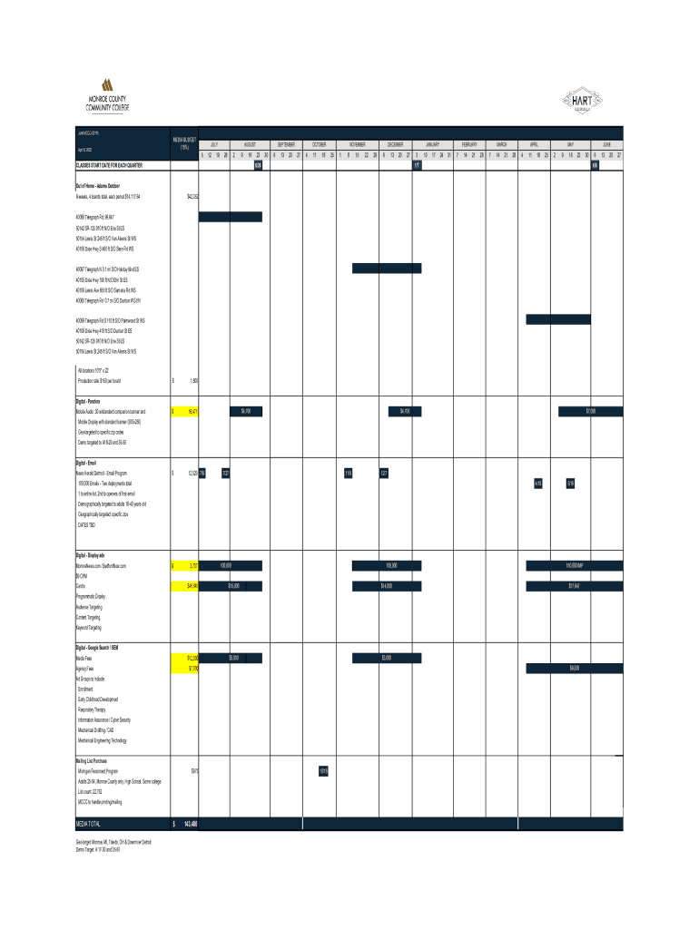 3/7 Job# MCCC00175 April 8, 2022MEDIA BUDGET (15%)JULY51219AUGUST262916CLASSES START DATE FOR EACH QUARTERSEPTEMBER233061320OCTOBER2741118NOVEMBER25181522DECEMBER2961320JANUARY278/2631017FEBRUARY243171421MARCH2871421APRIL2841118MAY252916JUNE231/7306