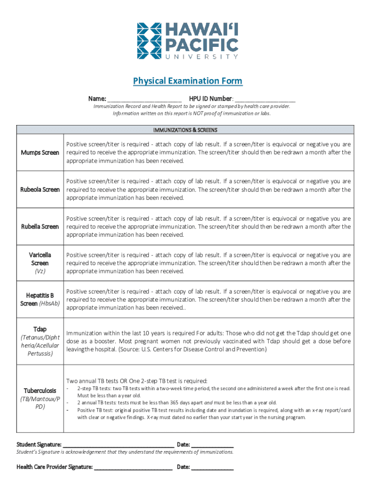 Physical Examination Form Name: ___CPU ID Number: ___Immunization Record and Health Report to be signed or stamped by health care provider. Information written on this report is NOT proof of immunization