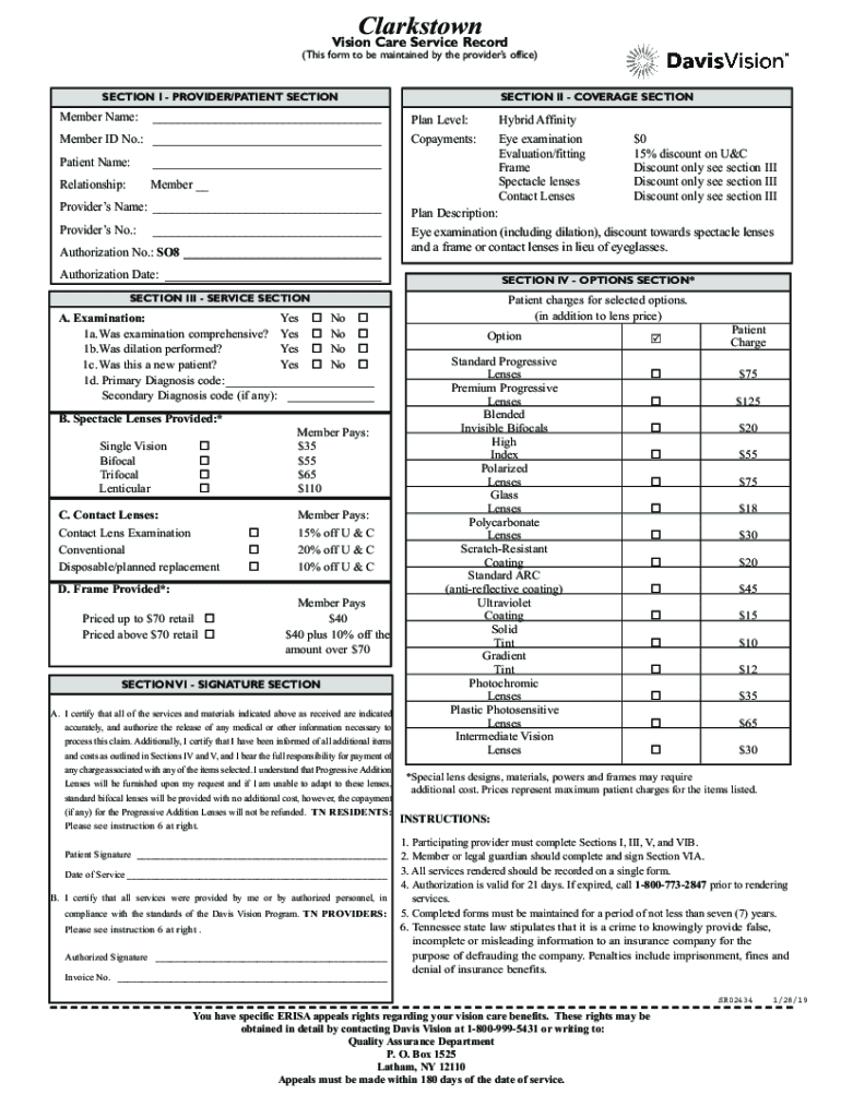 ClarkstownVision Care Service Record(This form to be maintained by the providers' office)SECTION I PROVIDER/PATIENT SECTIONMember Name:___Member ID No.: ___