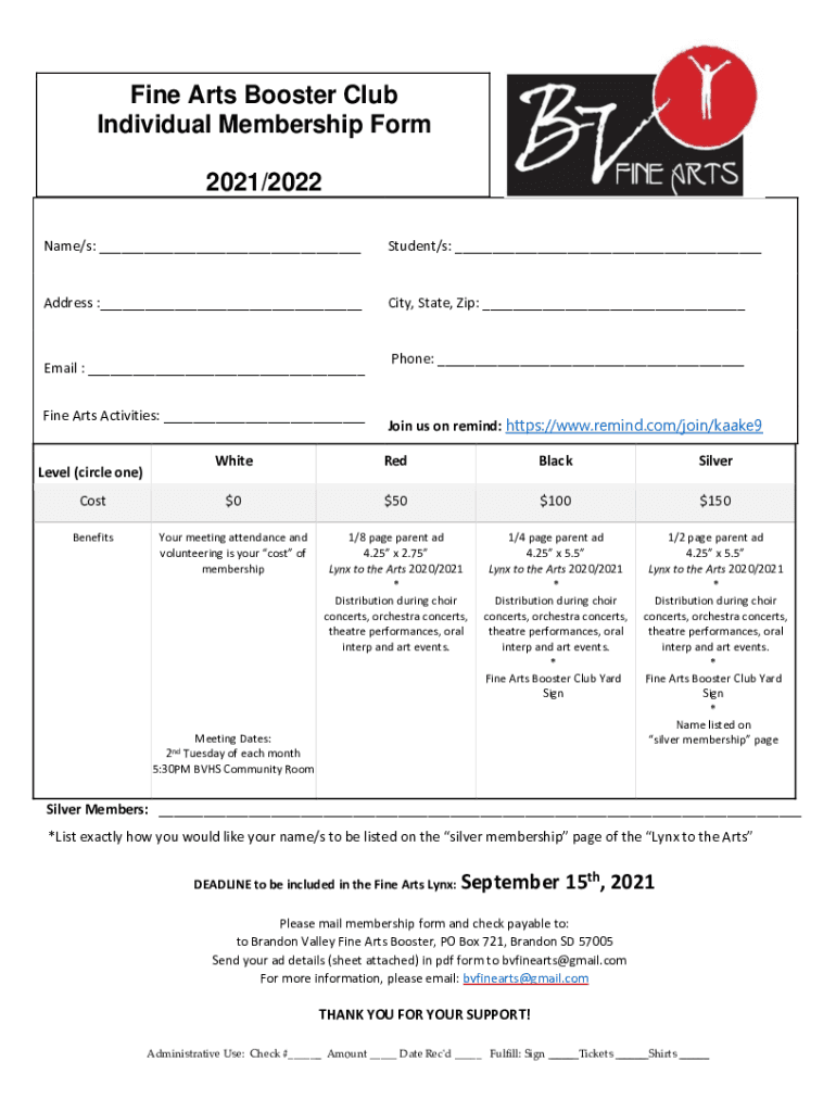 Fine Arts Booster Club Individual Membership Form 2021/2022 Name/s: ___Student/s: ___Address :___City, State, Zip: ___Email : ___ Fine Arts Activities: ___Phone: ___Join us on remind: https://www.remind.com/join/kaake9WhiteRedBlackSilverCost$$$050$100150BenefitsYour