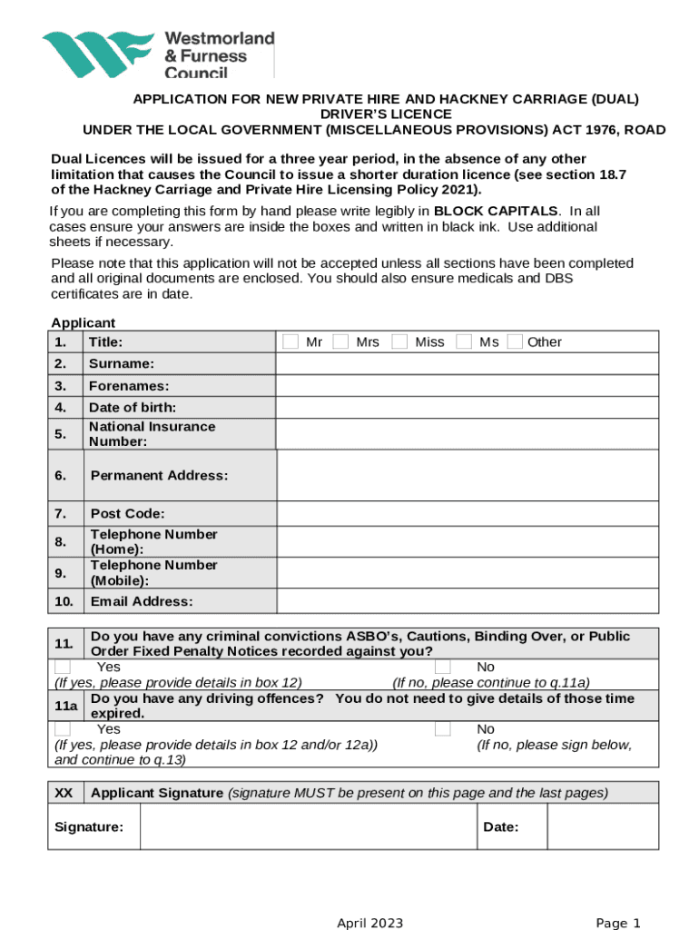Instructions for the form Hackney Carriage or Private Hire Driver New Application