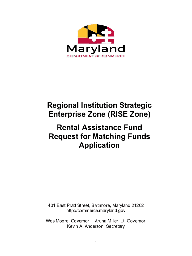 Regional Institution Strategic Enterprise Zone (RISE Zone) Rental Assistance Fund Request for Matching Funds Application401 East Pratt Street, Baltimore, Maryland 21202 http://commerce.maryland.gov