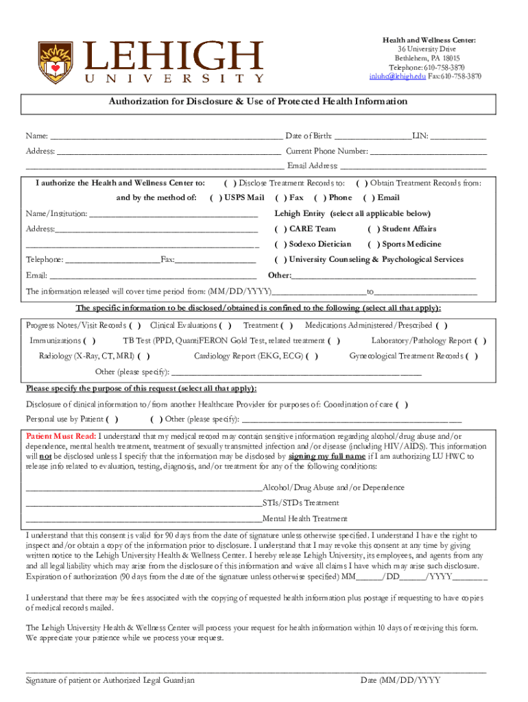 Health and Wellness Center: 36 University Drive Bethlehem, PA 18015 Telephone: 6107583870 inluhc@lehigh.edu Fax:6107583870Authorization for Disclosure & Use of Protected Health Information Name: ___